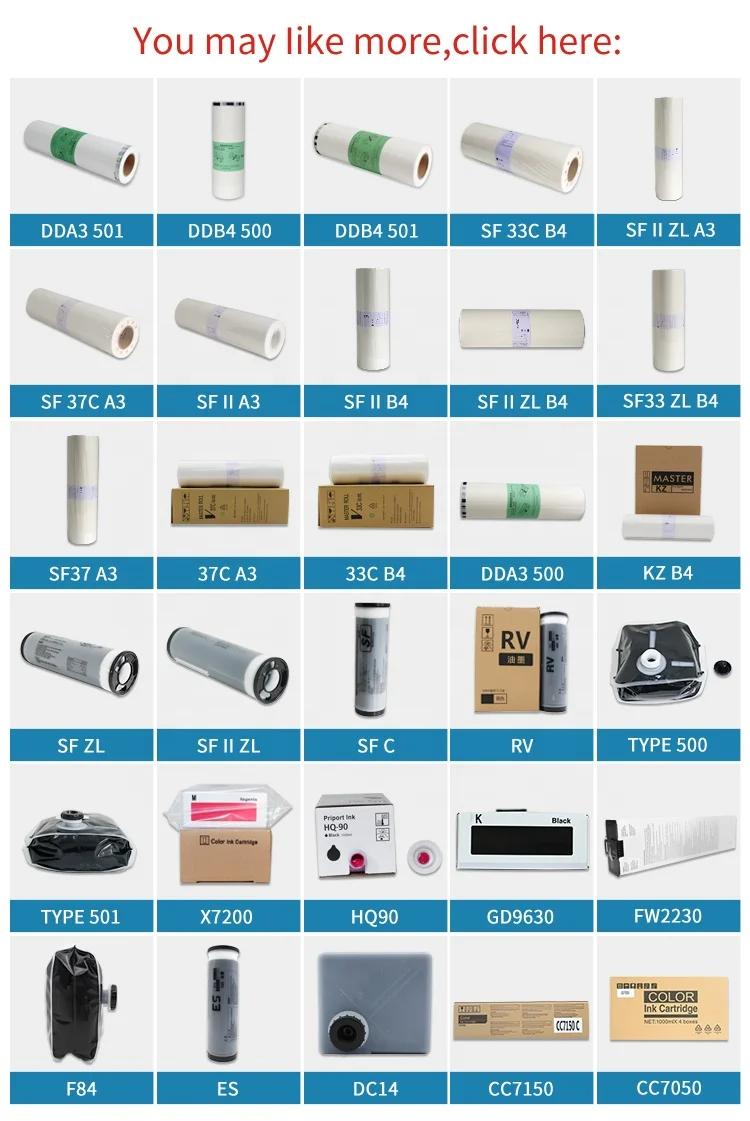 1.Krøllproblem: Meistren kan ikke installere maskinen hvis meistren har krøllproblem. Trommen kan ikke plukke opp meistren smooth hvis meistren krøller mer enn 90 grader når den henger naturlig ned. Våre meistere kan kontrollere krøllproblemet for å sikre at meisteren er i normal bruk. 2.Flathanne av meisteren: Overflaten på meisteren bør være jevn. Flathanne av meisteren påvirker trykkkvaliteten. Og meisteren vil skjeve hvis flatheten er dårlig. Våre meistere produseres med moden teknologi for å sikre jevnheten av produktene. 3.Fjerkels fra bompenget: Meisteren er laminert av bompenge og film, bompenge har fjerkels. Fjerkelsfraktering skyldes friksjon under meisterlagging, fjerkelen vil forurene termisk hodet, tromm eller gummibelt. deler etter at det har tapt fiber, og deretter påvirke trykkkvaliteten. Ved å bruke vår materiale kan fiberproblemet unngås for å beskytte maskinen. 4.Trykkkvalitet: Master er laminert med bomullspapir og film, bomullspapiret har fiber. Fiberavfall skyldes friksjon under lagring av master, og deretter påvirker det trykkkvaliteten. Ved å bruke vår materie kan fiberproblemet unngås for å beskytte maskinen. 5.Antall trykninger: Med god material og høy teknologi kan vår master kopiere fra 2500 til 5000 sider per ark. I sammenligning med 800 til 1500 sider per ark av andre merker. Det er økonomisk å velge vår.
