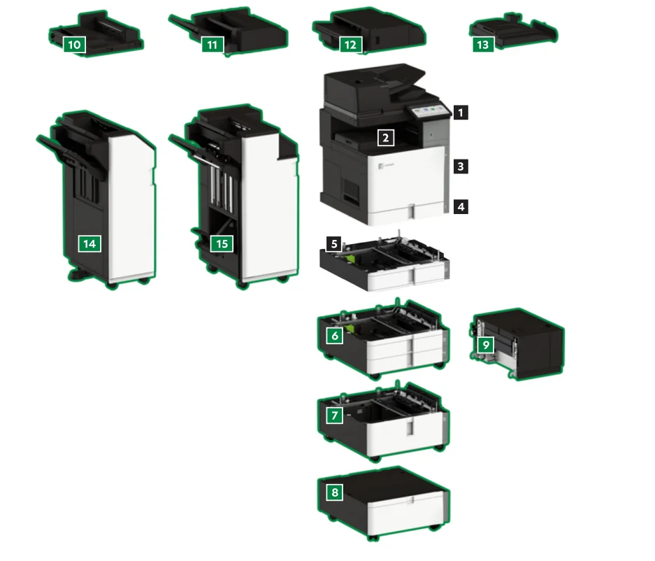 1. MFP leh touchscreen 25 cm 858 x 592 x 660 mm 2. binka output 500-safi Qeybta ah ee base model 3. feeder xiriir ah 150-cade Dhamaan ee ku yeedhiyo dalagaha base model 4. tray adeegga input 550-cade Dhamaan ee ku yeedhiyo dalagaha base model 5. tray adeegga input 550-cade 163 x 587 x 649 mm 6. 2 x tray adeegga input 550-cade 314 x 587 x 649 mm 7. tray adeegga input tandem 2000-cade - A4 314 x 587 x 649 mm 8. Cabinet 247 x 587 x 660 mm